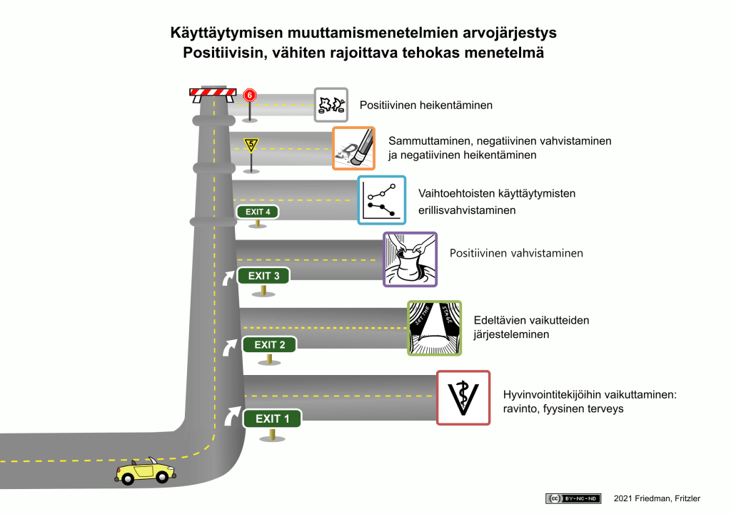 Mikäli kaikki aikaisemmat tiekartan risteykset ovat jo käytetty, päädymme vasta tällöin käyttämään operantin oppimisen nelikentän muodoista negatiivista heikennettä ja negatiivista vahvistetta. Myös käyttäytymisen sammuttaminen liittyy tähän risteykseen, johon tulen palaamaan erillisen blogitekstin kautta.
